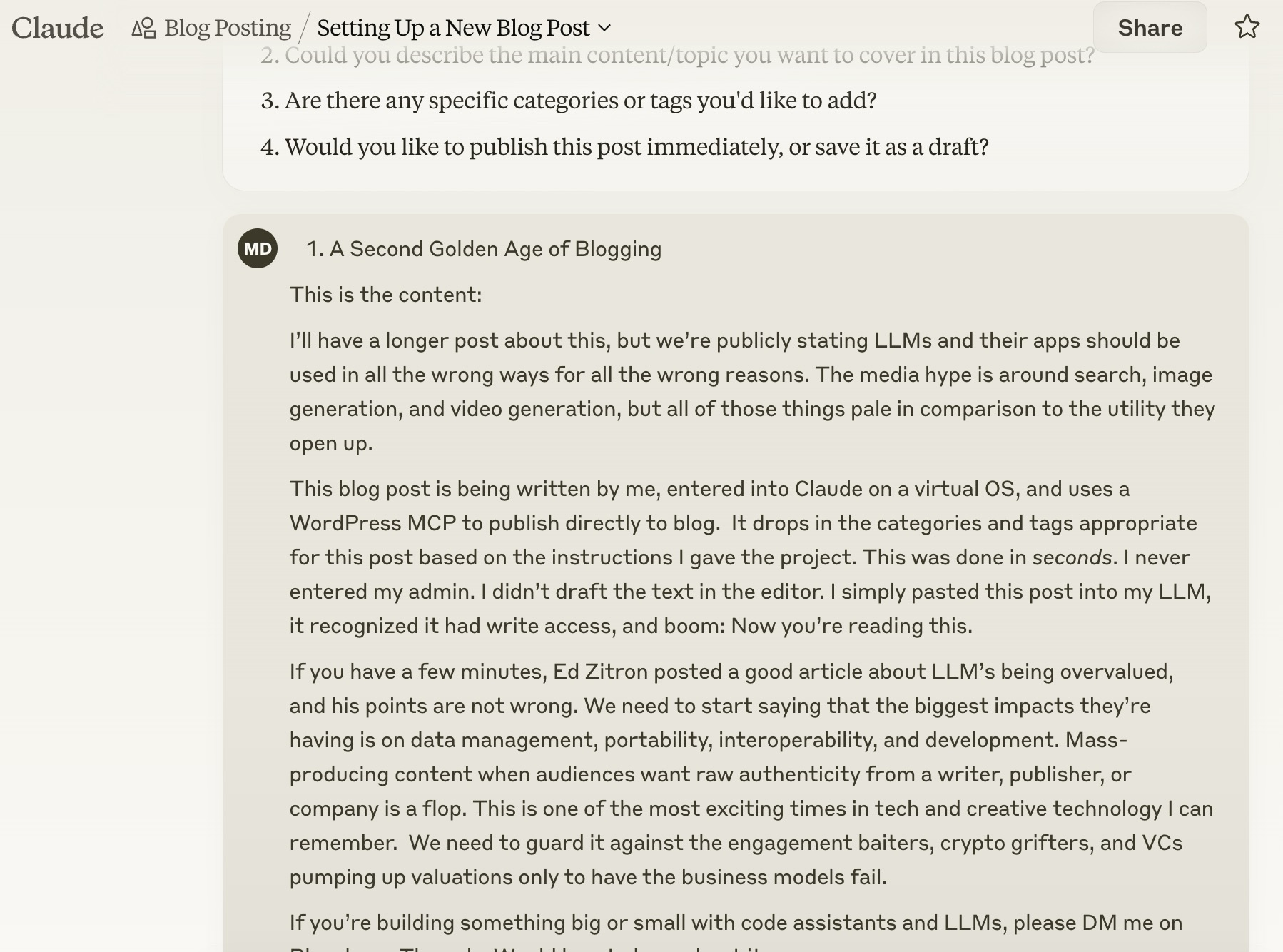 This blog post is being written by me, entered into Claude on a virtual OS, and uses a WordPress MCP to publish directly to blog. It drops in the categories and tags appropriate for this post based on the instructions I gave the project. This was done in seconds. I never entered my admin. I didn’t draft the text in the editor. I simply pasted this post into my LLM, it recognized it had write access, and boom: Now you’re reading this.